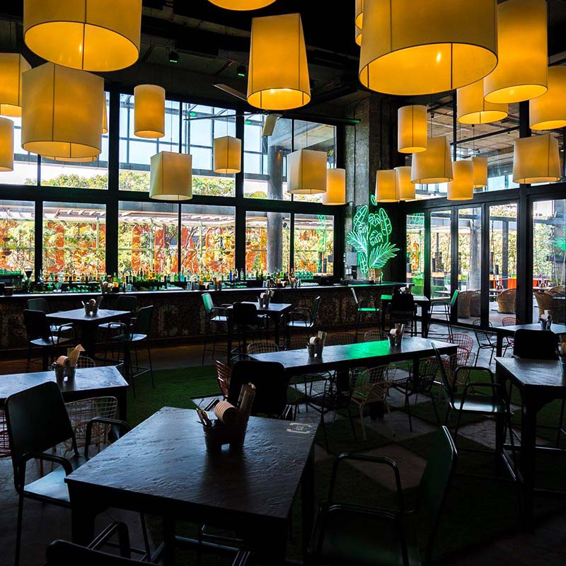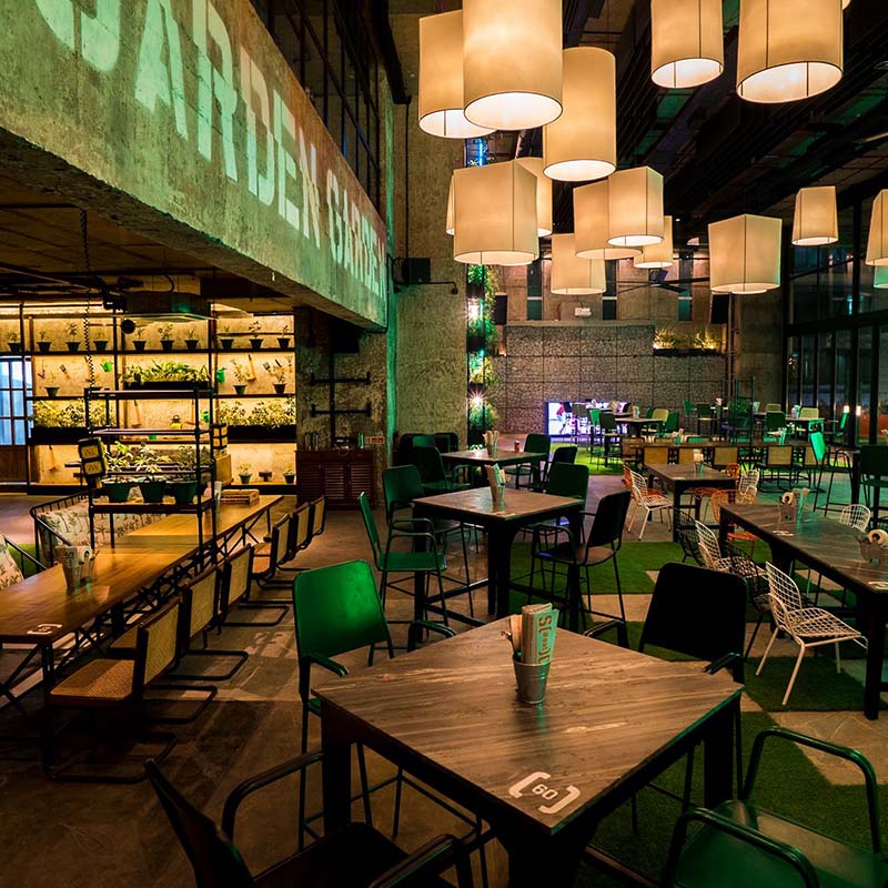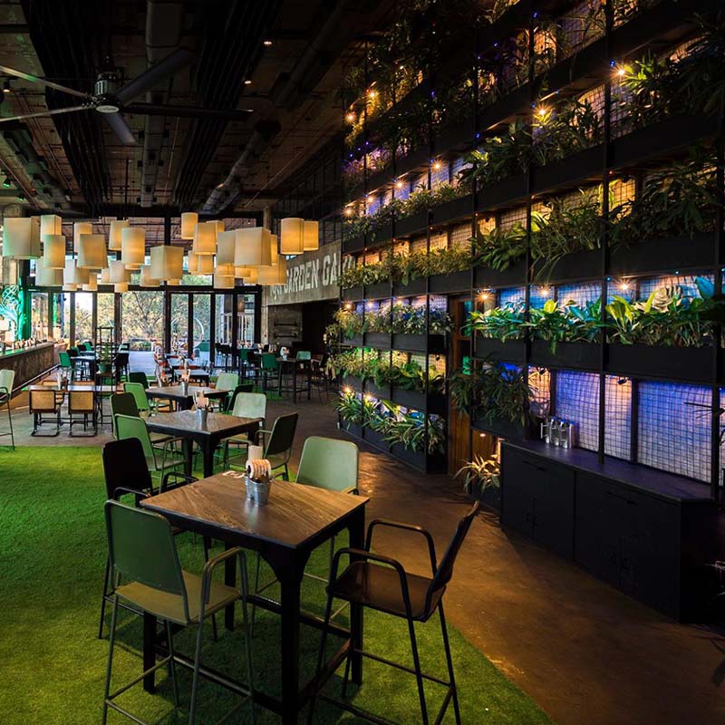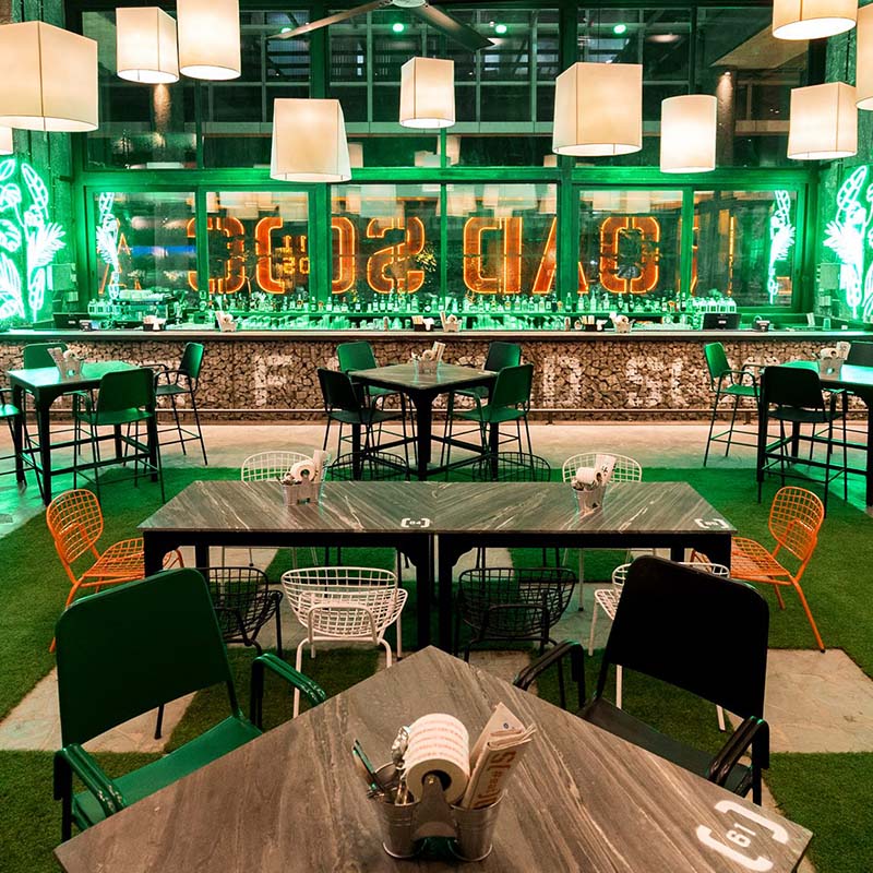 With games, goodies and greenery galore, F.C. Road Social is set to be THE place where you relive your youth – with some updates! The gabion stone wall, with its creepers, hides misty grasses behind its rustic exteriors, while the old world style living room, with cozy corners, and library units containing gardening tools, is an ode to life before technology. The turf flooring folds into benches surrounded with custom tree trunk lights and neon green glow boxes stacked up to add that all-important element of #Play to the settings!