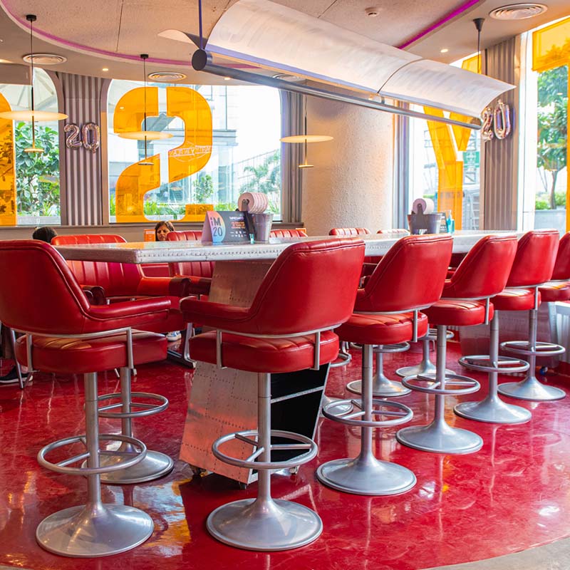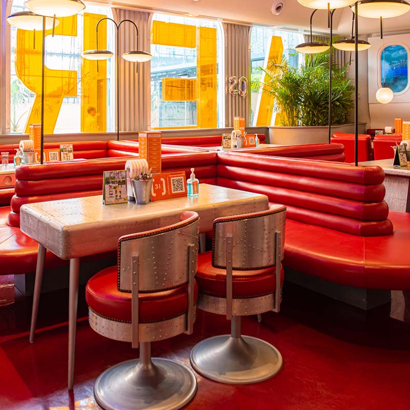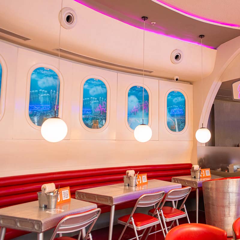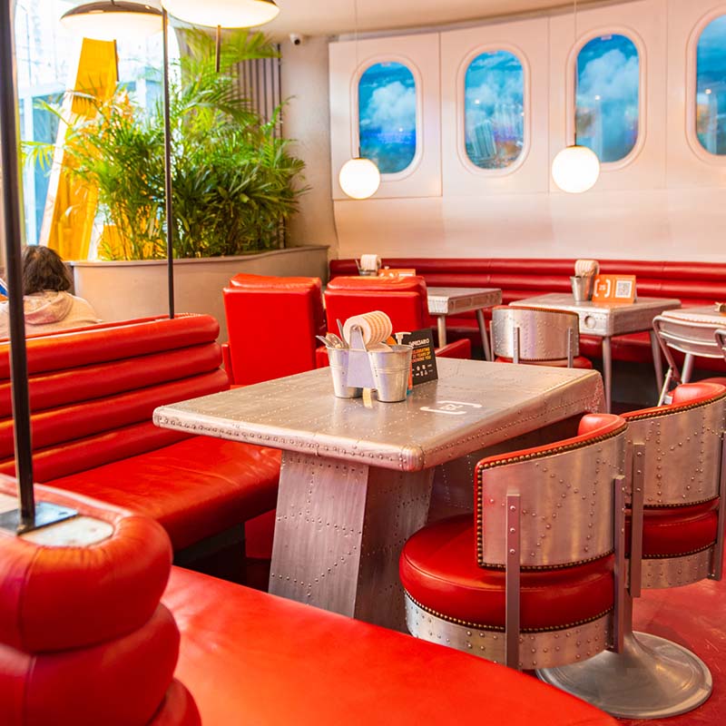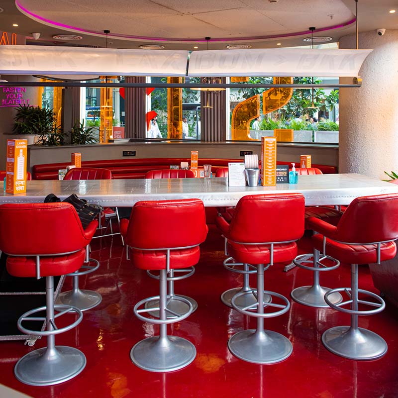 Keeping with the spirit of the neighbourhood, the design of the facade and interiors are inspired by a quirky aeronautical theme. Sit down by one of the window seats and soak in the many nuances that make the first-class flying experience come alive. For starters, the colour palette includes a trio of red, white, and glinting steel that are widely synonymous with the aviation industry. In addition to this, the outpost boasts circular domes and a classic bar, which will take you back to some of the poshest airport lounges. All these elements come together to delight customers and make them feel like they are flying with SOCIAL.