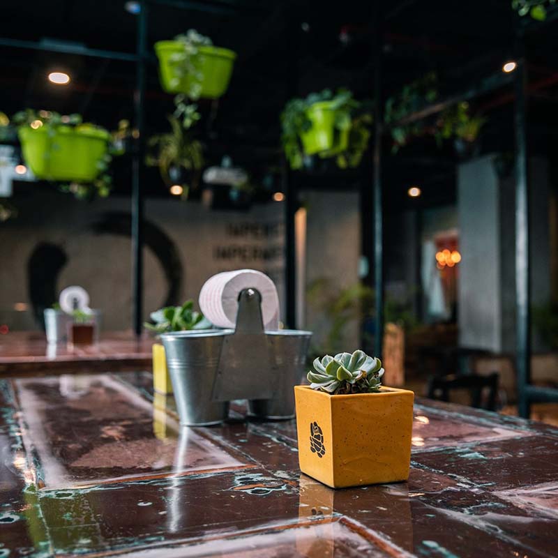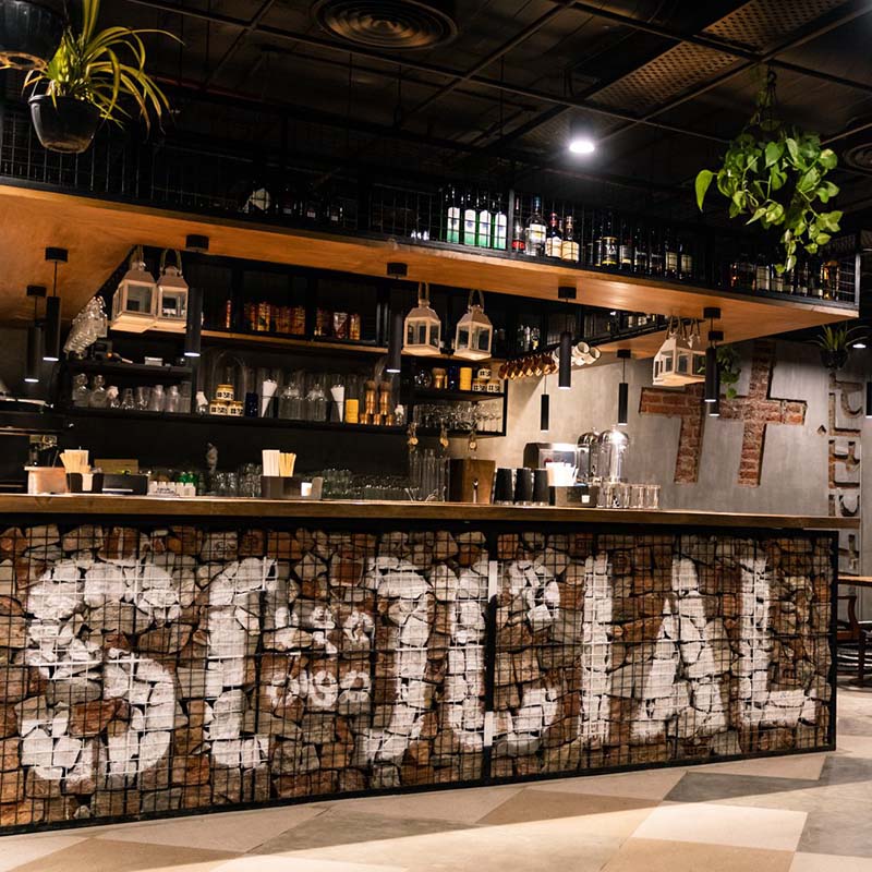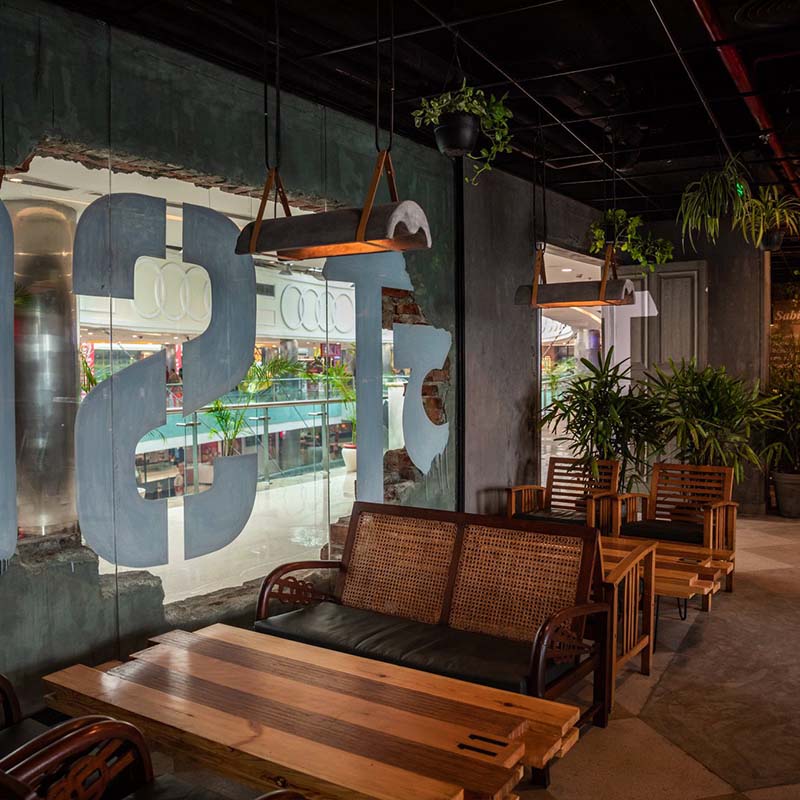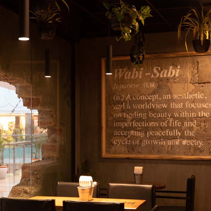 Vasant Kunj SOCIAL is built around the concept of wabi-sabi, a Japanese worldview that finds beauty in incompleteness and simplicity. The jagged concrete of the entrance is counter-pointed by cracks and breaks lacing through the walls. At the far end, a few lines of text pay homage to the philosophy that inspired the space, outlining the concept of wabi-sabi for everyone who walks in, while another wall features a simply drawn circle that stops just shy of closure, called an enso – a direct shout-out to wabi-sabi’s devotion to finding beauty in simplicity and imperfection.