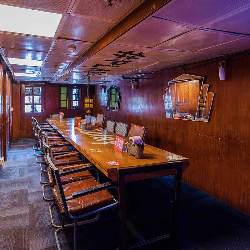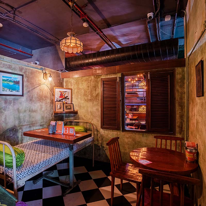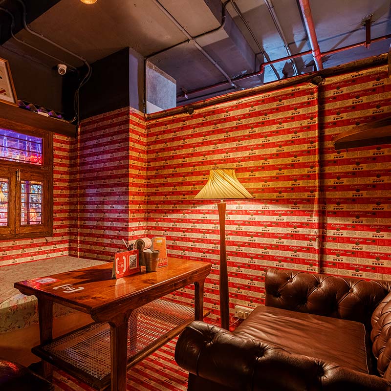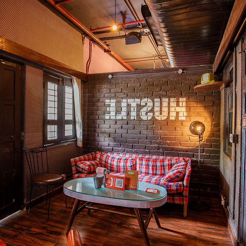 With ceramic tiling at the bar, and desi-chic stainless steel racks which hold the bar together, it’s hard to believe the space isn’t straight out of a Bollywood film set. Cyber Hub SOCIAL’s workspaces are designed to look like kholis on the outside – high tech cubicles on the inside that mirror the look of an endless corridor of rooms in a chawl.