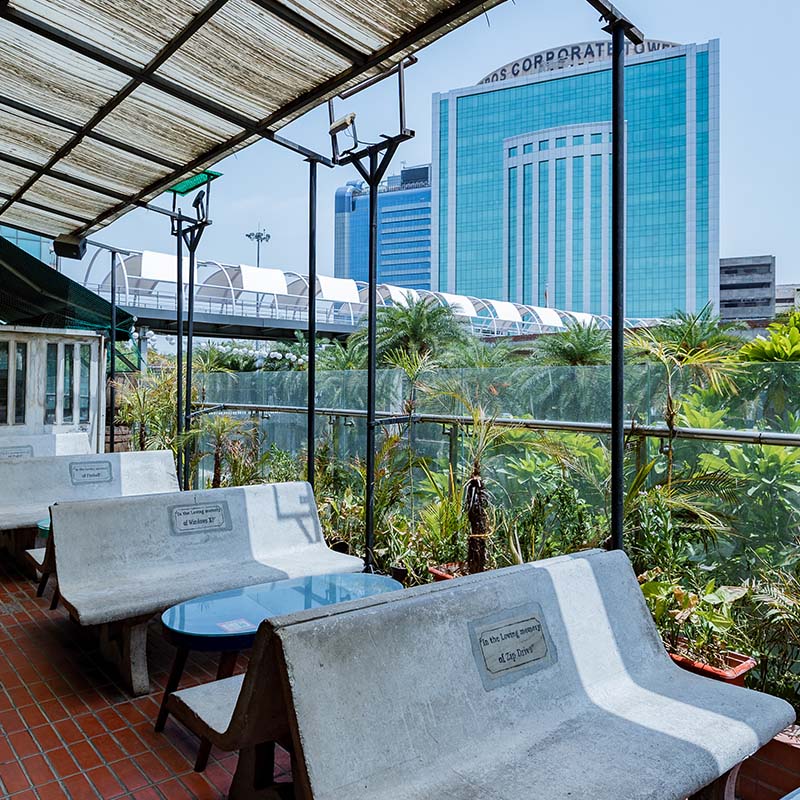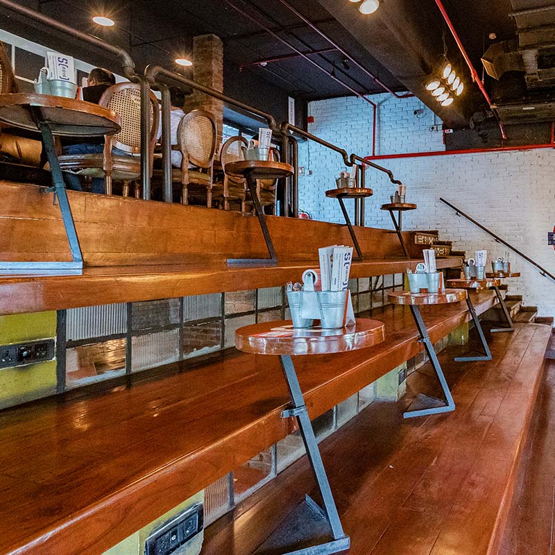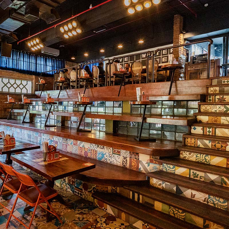 Here, you can go back in time with Ferris wheel booths and ride it as long as you don’t drop your food. Tables in the center might hit the ground if you want to sit down and eat, but go straight up with giant metal chains when you’re ready to party! If you want to play the role of spectator, sit on the massive steps that mimic stadium seating, or work out at the bar with Social’s half-cycles to make up for those weeks (months?) of gym you skipped. Of course, it wouldn’t be complete without odes to now defunct IT paraphernalia straight out a geeky collectors dream – a visual reminder of all that Nehru Place has meant to the city over the years.