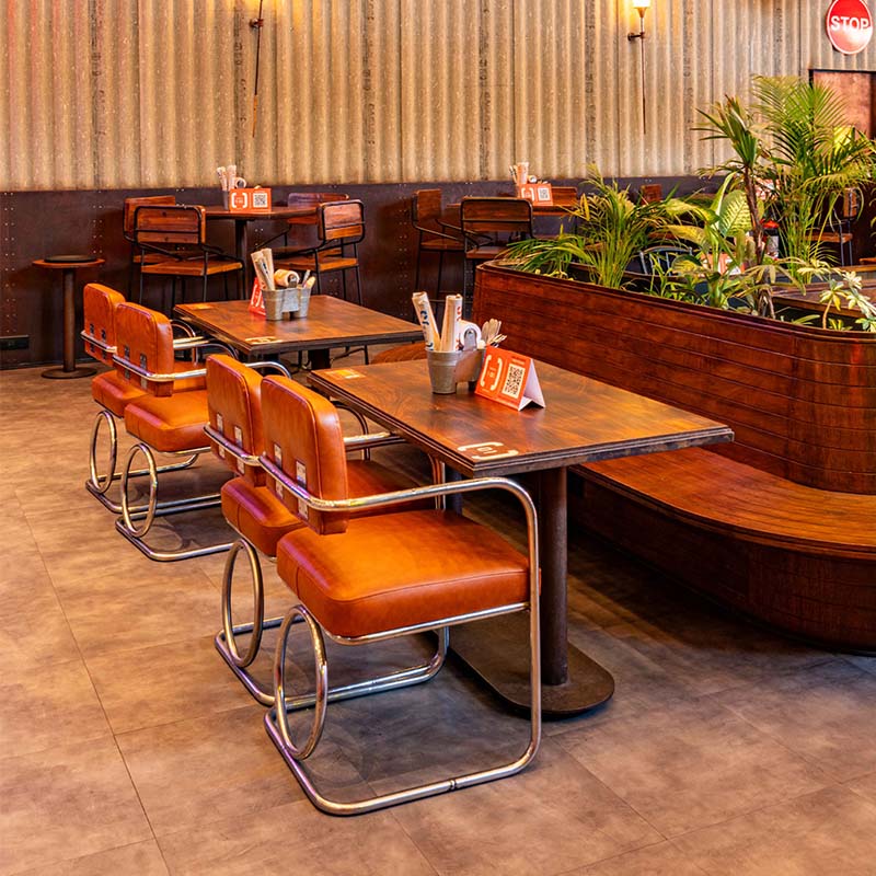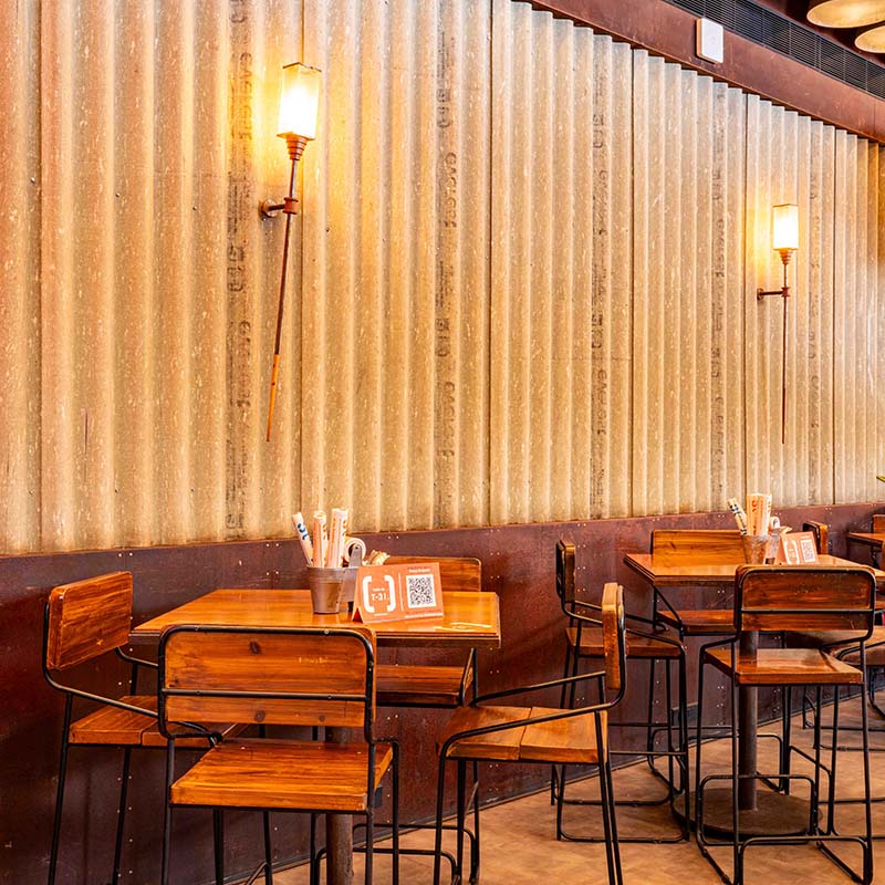 The entrance of the outpost is at the corner of the large corrugated metal sheet. Honouring its dedication to creating sustainable spaces, Chembur SOCIAL also affirms the brand’s goals with minimum intervention and maximum upcycling being a central focus.