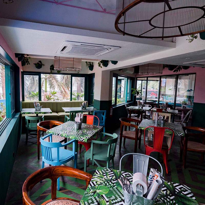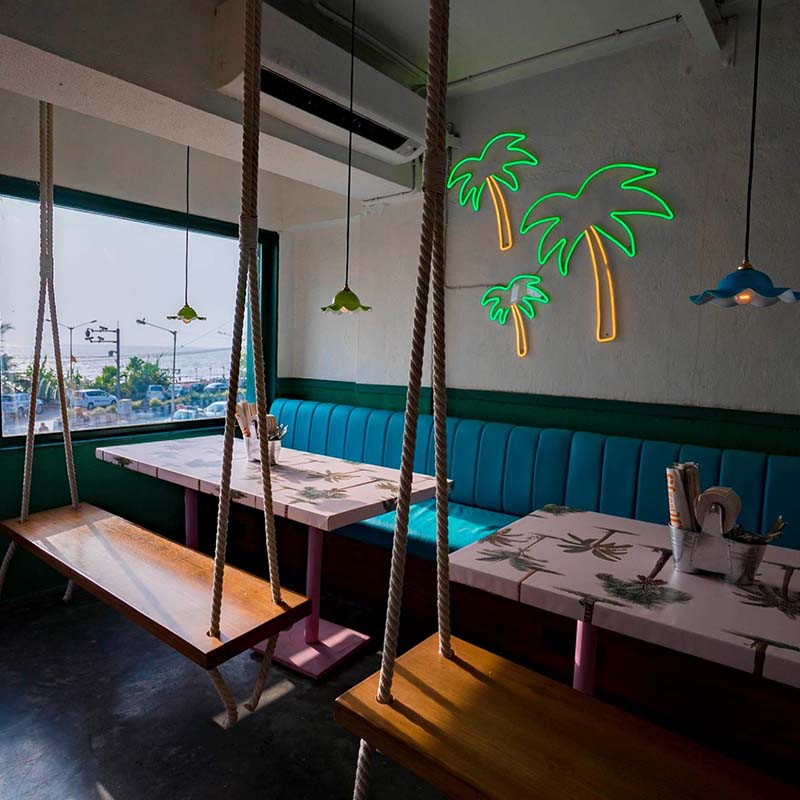 True to its iconic location, the outlet is designed with the intention of breathing sun, sand and sea into every nook and cranny of its space. The kitsch-meets-sparkling neon signage is complemented by summery pastel shades of baby pink & variants of green, and flanked by embroidered cane-like chairs alongside comfy lounge seating. The walls, patterned with tropical motifs, also boast some killer artwork by Manipuri artist Sony Thokchom!