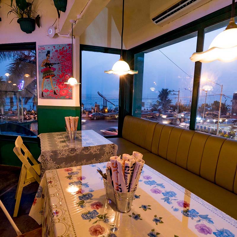 The undeniable pièce de résistance here, of course, is the breathtaking view of the setting sun from the sweeping glass windows of the outlet, accompanied by majestic views of the entire promenade, laid out against the crashing waves and the hustling bustle of life on Carter Road.