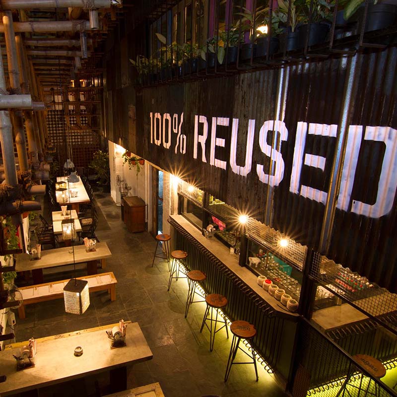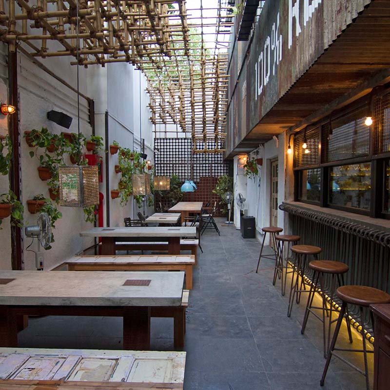 Everything at Khar Social is 100% upcycled, true to Social’s vision of using sustainable materials. Furthermore, the table tops are discarded timber-framed doors converted in the very state they were discovered, and the lights have been sourced and repurposed from doctor’s rooms.